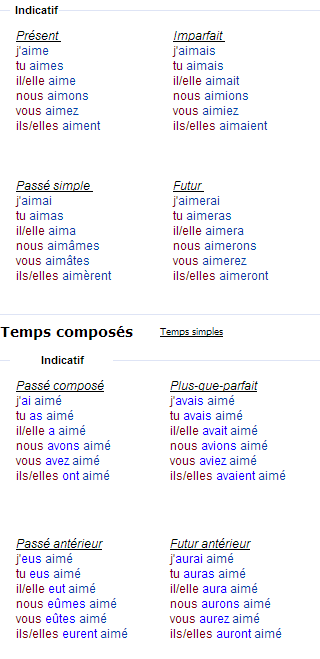 Глагол aimer входит в число самых часто используемых, поэтому постарайтесь запомнить хотя бы то, что написано в первой таблице – вторая рассказывает о более сложных формах. Все времена! Однако все знать невозможно, поэтому предлагаем воспользоваться схемами спряжения французского глагола aimer.