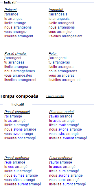 Глагол arranger входит в число самых часто используемых, поэтому постарайтесь запомнить хотя бы то, что написано в первой таблице – вторая рассказывает о более сложных формах. Все времена! Однако все знать невозможно, поэтому предлагаем воспользоваться схемами спряжения французского глагола arranger.