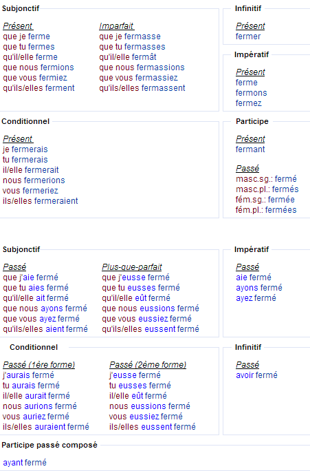Глагол fermer входит в число самых часто используемых, поэтому постарайтесь запомнить хотя бы то, что написано в первой таблице – вторая рассказывает о более сложных формах. Все времена! Однако все знать невозможно, поэтому предлагаем воспользоваться схемами спряжения французского глагола fermer.